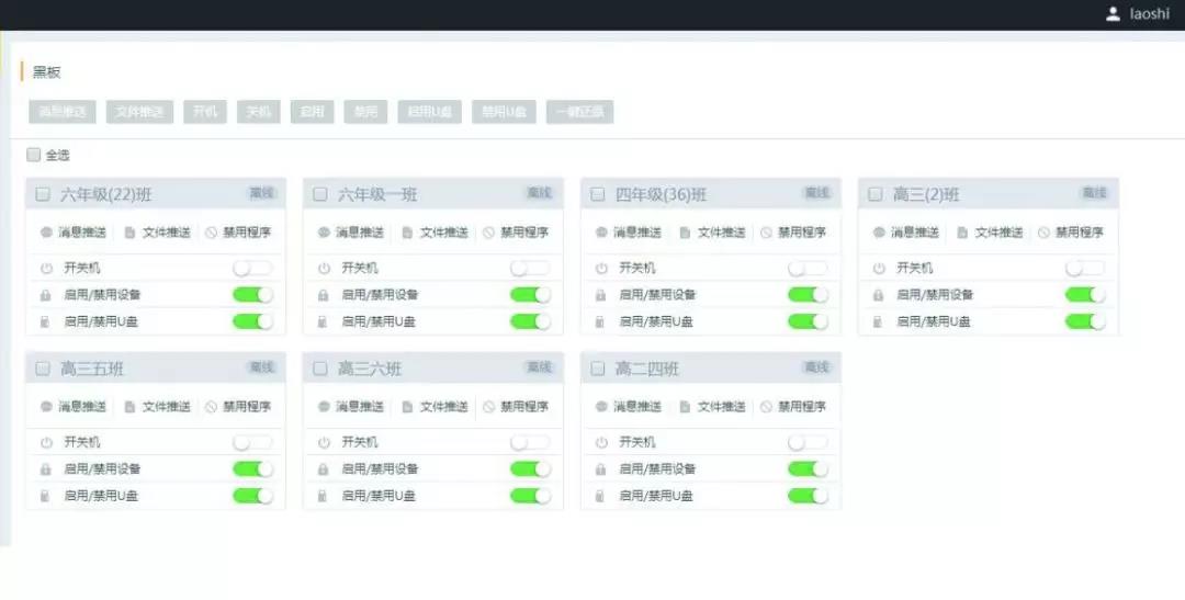 首先,授課老師可通過歐帝集中控制平臺,設置授課班級的課程表使得智慧教室互動黑板依照課程表開關機,也可將課件上傳和下載,將文件進行推送,擺脫對移動設備的依賴。其次,通過智能監控系統,可在跨網段下遠程監看,掌握每個班級的上課內容。