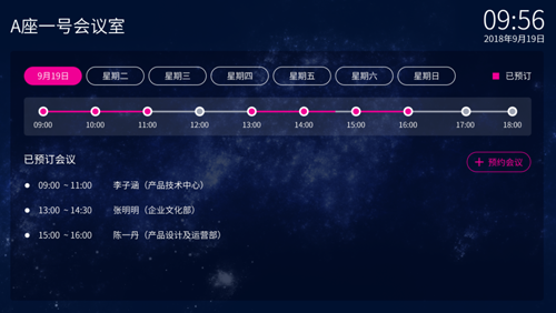 當人體偵測系統感知到人員進入會議室,中控系統將配合控制會議室設備自動開啟到相應的狀態,如燈光開啟、窗簾進入相應的狀態、會議設備自動打開、門口預約屏會顯示已占用和預訂已使用等信息,匯總屏、門口小屏、會議室中的設備等顯示統一狀態信息,各相關辦公軟件(如outlook、OA、唯秘App、會議預約系統等)顯示會議室的狀態信息也即時更新同步。