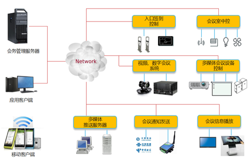 除了線上會議預約,會務全程一站式管理,云會務系統還可對接外部系統,如廣州唯品會就根據企業自身需求,定制化對接人體偵測系統、中控系統、Mini CC、維秘App(唯品會公司自用App)等,并進行會議室分合處理操作,將各子系統集成在一起,形成一個多功能的會議系統。
