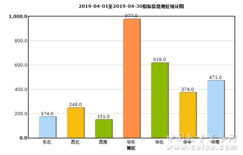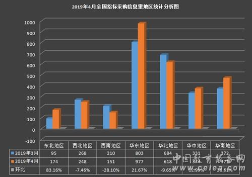 綜合4月全國招標采購信息量地區統計分析圖(如圖5所示):東北地區環比增長83.16%;華南地區環比增長26.61%;華東地區環比增長21.67%;華中地區環比增長12.99%;西南地區環比下降28.10%;華北地區環比下降9.65%;西北地區環比下降7.46%。