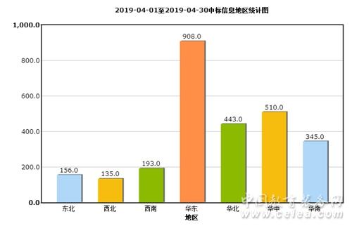從4月中標信息地區統計圖(如圖8所示)和全國中標信息地區占比圖(如圖9所示)來看:華東地區中標信息量為908條,占比34%;華中地區中標信息量為510條,占比19%;華北地區中標信息量為443條,占比16%;華南地區中標信息量為345條,占比13%;西南地區招中標信息量為193條,占比7%;東北地區中標信息量為156條,占比6%;西北地區中標信息量為135條,占比5%。