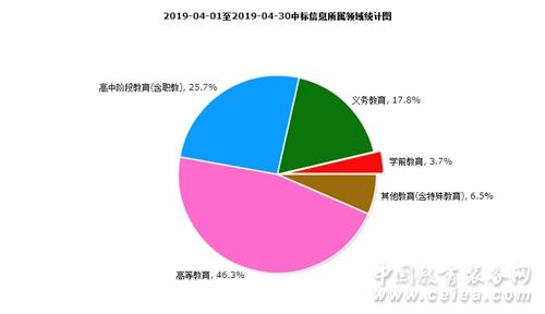 4月中標信息所屬領域統計圖,如圖10所示:學前教育占比為3.7%;義務教育占比為17.8%;高中階段教育(含職教)占比為25.7%;高等教育占比為46.3%;其他教育(含特殊教育)占比為6.5%。