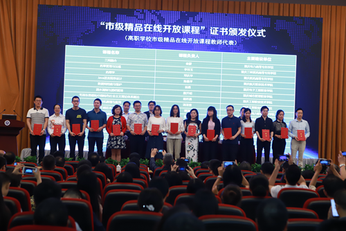 市教育技裝中心黨總支書記、市課程協作組副主任姚友明宣讀了重慶市高校第二批精品在線開放課程認定結果,與會領導一起為獲得市級精品在線開放課程認定的本科及高職的教師代表頒發了認定證書。