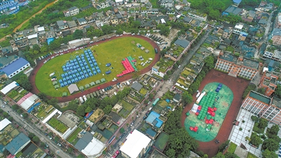 6月18日無人機拍攝的長寧縣雙河鎮雙河中學安置點。新華社發