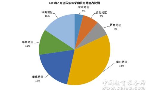 從5月招標采購信息地區統計圖(如圖3所示)和全國招標采購信息量地區占比圖(如圖4所示)來看:華東地區招標采購信息量為1112條,占比35%;華北地區招標采購信息量為604條,占比19%;華南地區招標信息采購量為492條,占比16%;華中地區招標采購信息量為366條,占比12%;西北地區招標采購信息量為228條,占比7%;西南地區招標采購信息量為217條,占比7%;東北地區招標采購信息量為123條,占比4%。