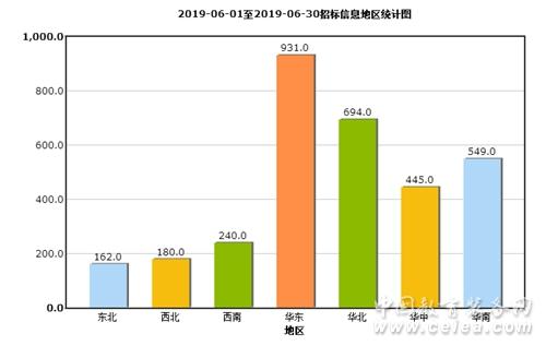 從6月招標(biāo)采購(gòu)信息地區(qū)統(tǒng)計(jì)圖(如圖3所示)和全國(guó)招標(biāo)采購(gòu)信息量地區(qū)占比圖(如圖4所示)可以看出:華東地區(qū)招標(biāo)采購(gòu)信息量為931條,占比29%;華北地區(qū)招標(biāo)采購(gòu)信息量為694條,占比22%;華南地區(qū)招標(biāo)信息采購(gòu)量為549條,占比17%;華中地區(qū)招標(biāo)采購(gòu)信息量為445條,占比14%;西南地區(qū)招標(biāo)采購(gòu)信息量為240條,占比7%;西北地區(qū)招標(biāo)采購(gòu)信息量為180條,占比6%;東北地區(qū)招標(biāo)采購(gòu)信息量為162條,占比5%。