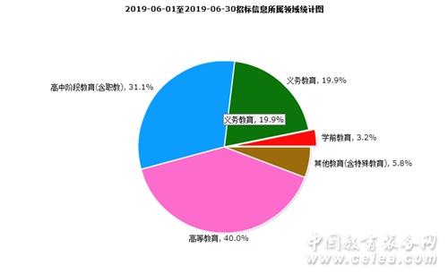 6月份招標(biāo)采購(gòu)信息所屬領(lǐng)域統(tǒng)計(jì)情況如圖6所示:學(xué)前教育占比為3.2%;義務(wù)教育占比為19.9%;高中階段教育(含職教)占比為31.1%;高等教育占比為40.0%;其他教育(含特殊教育)占比為5.8%。