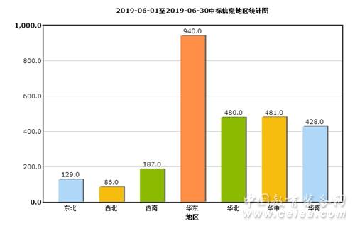 從6月中標(biāo)信息地區(qū)統(tǒng)計(jì)圖(如圖8所示)和全國(guó)中標(biāo)信息地區(qū)占比圖(如圖9所示)來(lái)看:華東地區(qū)中標(biāo)信息量為940條,占比34%;華中地區(qū)中標(biāo)信息量為481條,占比18%;華北地區(qū)中標(biāo)信息量為480條,占比17%;華南地區(qū)中標(biāo)信息量為428條,占比16%;西南地區(qū)招中標(biāo)信息量為187條,占比7%;東北地區(qū)中標(biāo)信息量為129條,占比5%;西北地區(qū)中標(biāo)信息量為86條,占比3%。