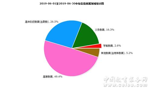 6月中標(biāo)信息所屬領(lǐng)域統(tǒng)計(jì)圖,如圖10所示:學(xué)前教育占比為2.6%;義務(wù)教育占比為16.3%;高中階段教育(含職教)占比為26.5%;高等教育占比為49.4%;其他教育(含特殊教育)占比為5.2%。