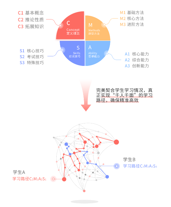 知識圖譜能給出學生的考點薄弱環節,并推斷關聯考點的受影響情況,針對性制定學習方案,但名師的授課方式,例如講述形式、點撥形式、理解知識的技巧,是AI體系難以觸及的知識點之外的問題。知識圖譜做得再漂亮再有邏輯,每一個節點的掌握除了做題驗證等方式,名師的價值也不言而喻。