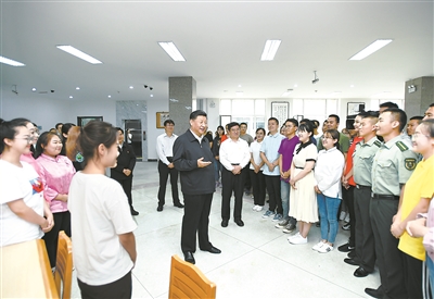 正值暑假,圖書館閱覽室還有不少學生在學習。看到總書記走進來,大家頓時沸騰起來,聚攏到總書記身邊。習近平親切地同他們打招呼,詢問學習生活情況。他指出,少年強則中國強。未來的競爭是年青人的競爭,今天的年青人是實現第二個百年奮斗目標的骨干和棟梁。同學們要志存高遠、腳踏實地,學好知識,打好基礎,增長才干,將來為中華民族偉大復興貢獻自己的智慧和力量。