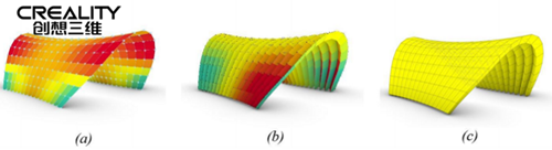 模塊生成:(a)初始曲面細分為雙曲面四邊形,顏色表示雙曲率;(b)平面化四邊形網格,帶雙曲面,提供結構深度;(c)平面化四邊形網格,帶平面空間結構,單列Ur表示平面度。