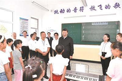 8月19日至22日,中共中央總書記、國家主席、中央軍委主席習近平在甘肅考察。這是21日上午,習近平在武威市古浪縣黃花灘生態移民區富民新村富民小學的音樂教室,認真觀看正在進行的音樂課教學。新華社記者 謝環馳 攝