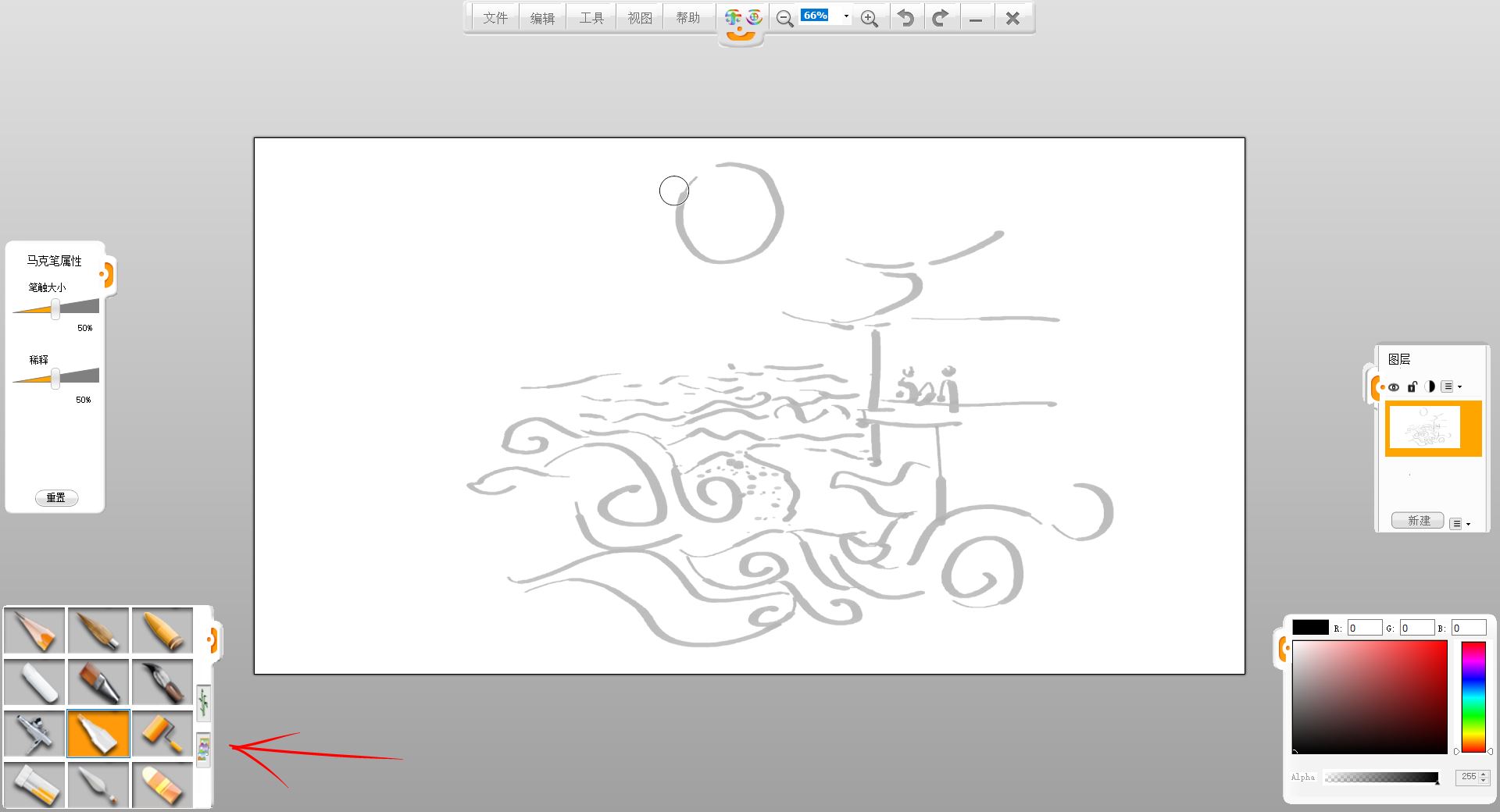 3.使用畫筆欄的馬克筆筆觸,把心中的畫面用單一顏色概略的畫出,確定大概構圖,這一步驟畫的草圖最后不顯示,所以不用很精致。