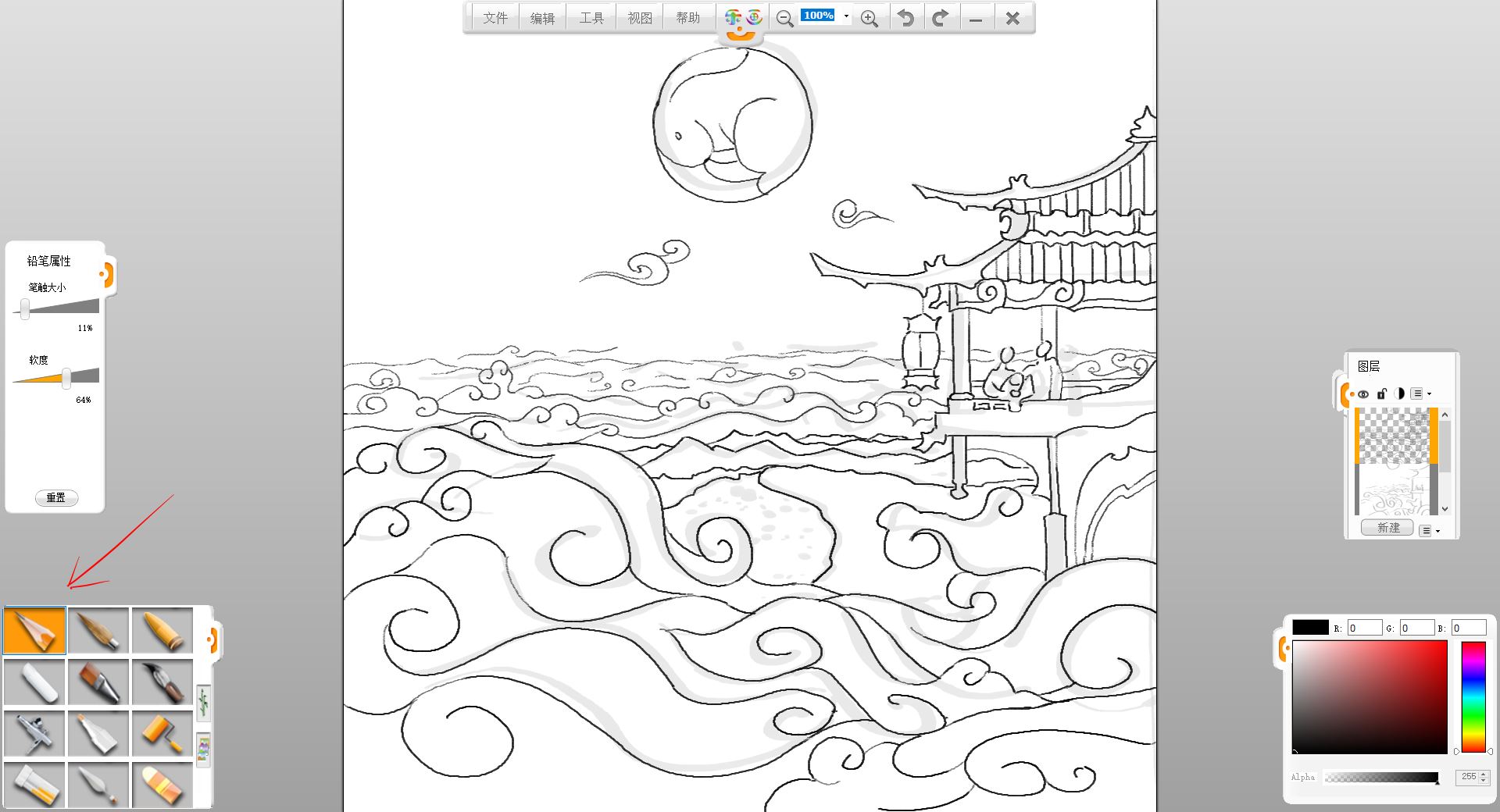 6.用鉛筆筆觸繪制閣樓、人物、近處祥云的和云下小城的輪廓,配合橡皮擦筆觸修改。