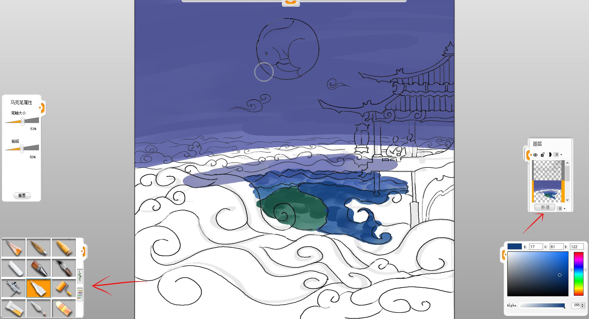 10.新建一個圖層,用馬克筆筆觸給小樓和賞月的一家三口簡單鋪色。