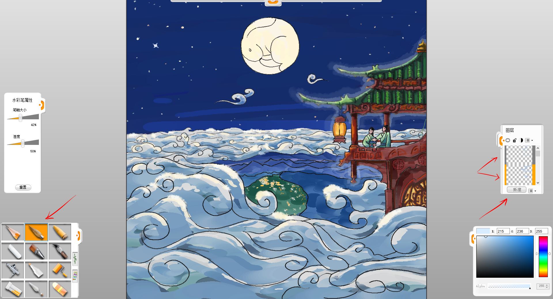 19. 最后潤色調整些細節,擦掉一些邊邊角角沒畫好的,這樣一副中秋瓊宇賞月圖就完成了。