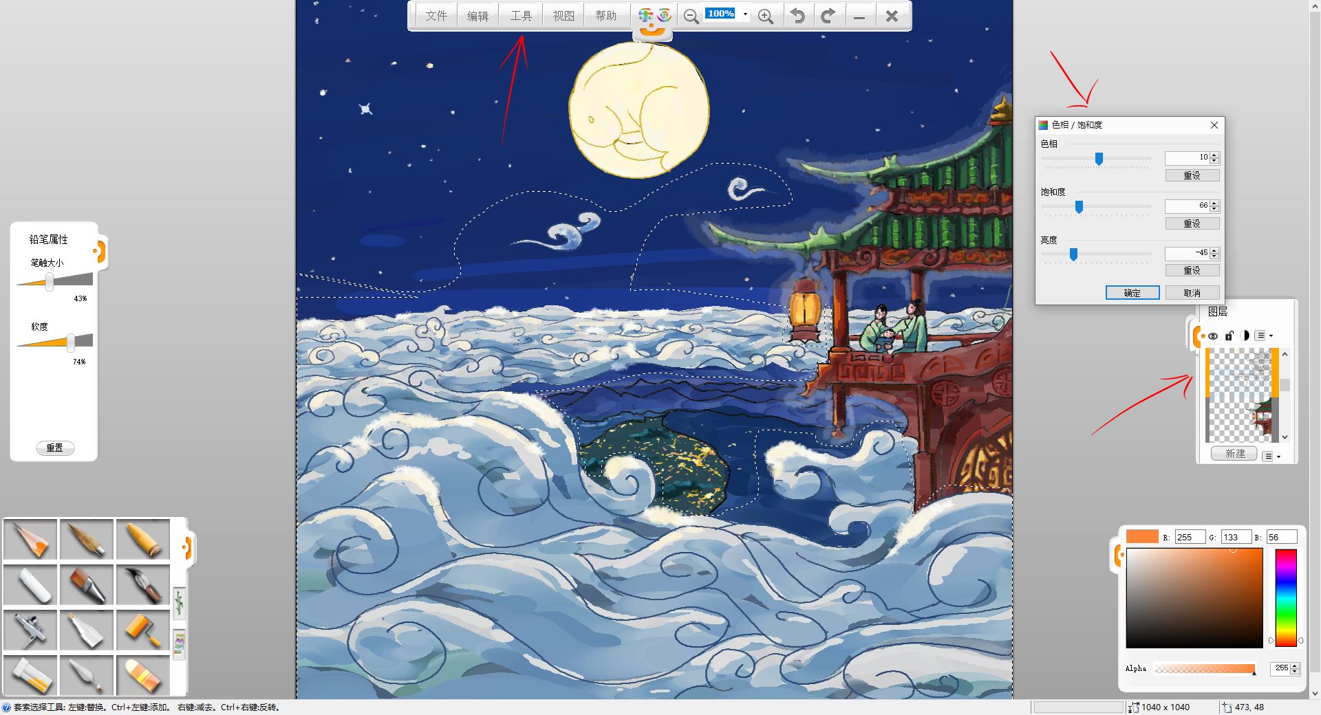 12.用“工具”-“調整”-“色相/飽和度”調整工具,調整云暗面圖層的色相,使其更符合環境色。然后合并樓宇,人物圖層,使用鉛筆工具,刻畫建筑圖案和陰影等細節,對著月亮和燈籠的一面偏亮,背著的一面偏暗,線稿也可以稍作調整。