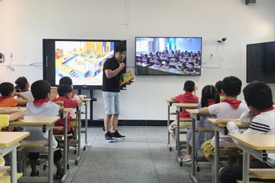 來自暨陽小學的丁圓偉老師帶著精彩的繪本故事來到諸暨市同山鎮達材完小,與暨陽小學的孩子隔空對話,同學一本書,兩校師生進行實時互動。同步課堂讓山里的孩子和城里的孩子一起享受科技帶給教學的新活力。