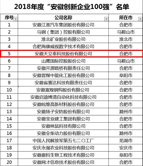 2018年度“安徽創新企業100強”榜單公布:天立泰科技登榜單前五!