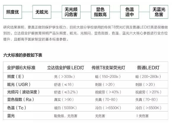 在護眼燈具從照度到藍光危害的六大硬性指標上,立達信相關產品性能遠遠高于國家標準,并在使用中保持長久的能效。