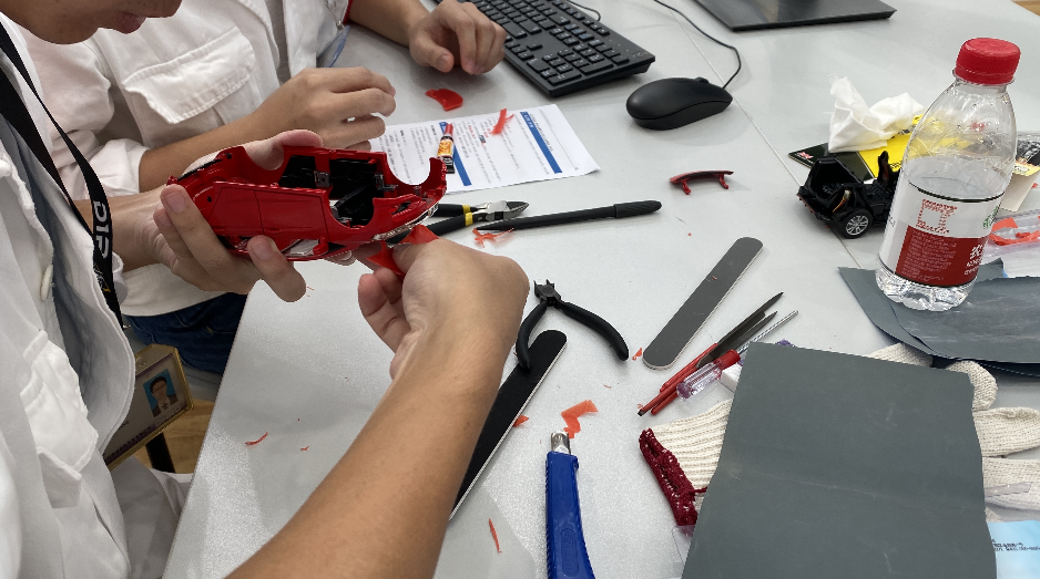 參賽選手正在精心打磨他們用3d打印機打印出來的參賽作品