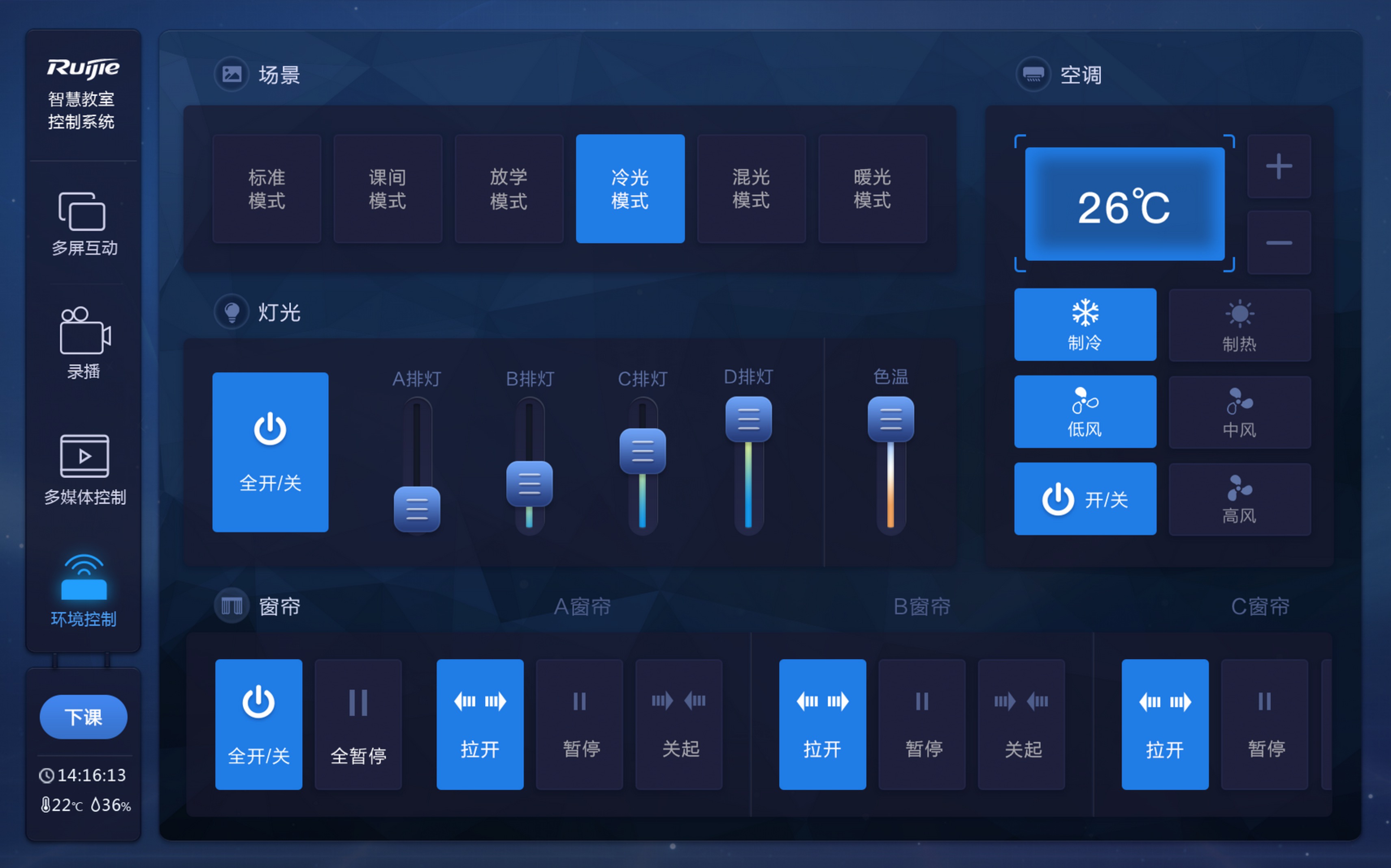 對學校而言:確保了教室環(huán)境滿足國家相關標準,綜合節(jié)能70%以上,集中管控,降低維護、維修成本,提高老師教學效率與效果。