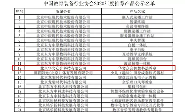 近日,中國教育裝備行業(yè)協(xié)會(huì)正式公示“2020年度推薦產(chǎn)品”。華文眾合智慧書法教室經(jīng)過層層評(píng)審,成功入選。
