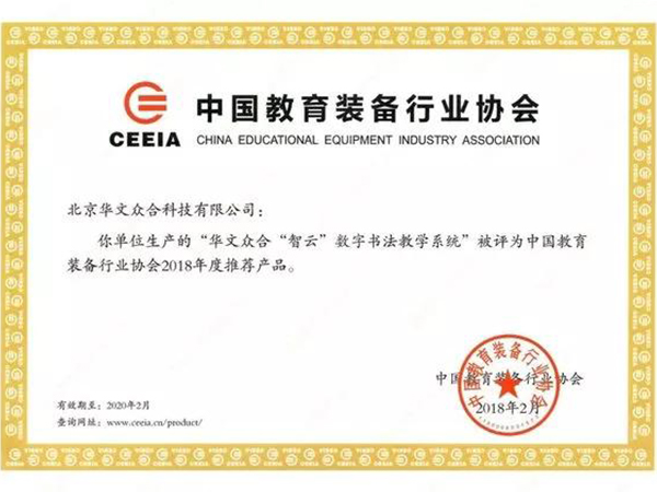 華文眾合智慧書法教室入選2018年度中國教育裝備行業(yè)協(xié)會(huì)推薦產(chǎn)品
