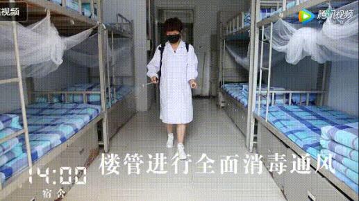 13點(diǎn),學(xué)生午休。14點(diǎn),宿舍消毒準(zhǔn)備,學(xué)生們?cè)趶V播提醒聲中起床、迅速前往教室。