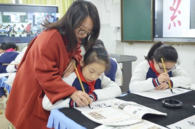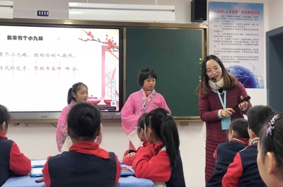 活動中,來自華舍小學的美術老師謝斐斐、音樂老師戴芳分別給本校及百里以外的平水上灶小學、玉安小學三地的孩子們上了書法課《絞絲旁》、音樂拓展課越劇《我家有個小九妹》。課堂上,三校學生利用平板進行搶答、回答問題、作品上傳;在越劇課堂中,學生們人手一把扇子、一個平板,戴芳老師利用現代教育技術,通過有趣的學、唱、演等游戲環節,帶領四年級的小朋友們走進了小梅花越劇,讓越劇課變得更加生動活潑。