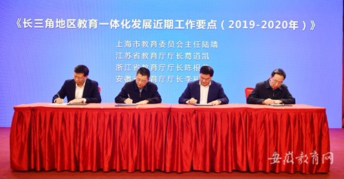 會上,一市三省教育行政部門負責同志共同簽署了《長三角教育一體化發展近期工作要點(2019-2020年)》,明確了到2020年,長三角教育將率先在高教、基教、職教、師資、教育規劃等若干領域進一步加強協同,實現重點突破。其中,在高等教育領域,將探索組建長三角高校協同創新及其他特色聯盟,推動產學研合作,逐步共享優質高等教育資源;在基礎教育領域,將共同打造長三角基礎教育年度峰會,構建聯合教研、校外實踐、研學旅行等資源共享機制;在職業教育領域,將打造職業院校名師、名校長工作室的共享平臺,促進課程體系、實踐實習、創新創業等方面的開放協作;在管理干部和師資隊伍方面,將探索建立各級各類學校骨干教師、優秀中青年干部等交流掛職機制,持續推進校長、教師聯動培訓平臺。
