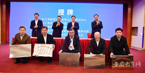 會上,一市三省教育行政部門與會負責同志為“長三角教管服一體化智慧思政平臺項目”“長三角教育發展政策與法治研究中心建設項目”“長三角醫學教育聯盟建設項目”“長三角校園足球平臺建設實踐及美育聯盟建設構想”“長三角產教融合與職業教育發展研究院建設項目”授牌。