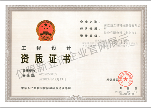 近日,新立訊科技股份有限公司獲得由江蘇省住房和城鄉建設廳頒發的“建筑智能化系統設計專項乙級”資質證書,證書編號:A232050455。