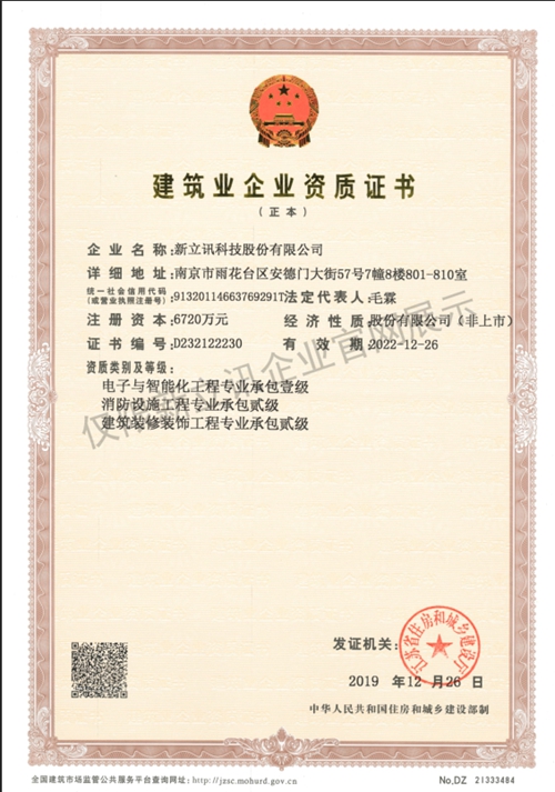 近日,經江蘇省住房和城鄉建設廳審核批準,新立訊科技股份有限公司成功取得“電子與智能化工程專業承包壹級資質”。該項資質為電子工程、建筑智能化行業最高等級資質,對企業綜合實力有嚴格的要求,獲得此資質可承擔不受限額的各類電子工程、建筑智能化項目。