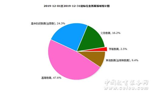 12月份招標(biāo)采購信息所屬領(lǐng)域統(tǒng)計情況如圖6所示:學(xué)前教育占比為2.5%;義務(wù)教育占比為16.2%;高中階段教育(含職教)占比為24.3%;高等教育占比為47.6%;其他教育(含特殊教育)占比為9.4%。