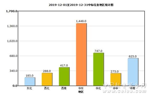 從12月中標(biāo)信息地區(qū)統(tǒng)計圖(如圖8所示)和全國中標(biāo)信息地區(qū)占比圖(如圖9所示)來看:華東地區(qū)中標(biāo)信息量為1448條,占比36%;華北地區(qū)中標(biāo)信息量為747條,占比19%;華南地區(qū)中標(biāo)信息量為625條,占比16%;西南地區(qū)招中標(biāo)信息量為417條,占比10%;西北地區(qū)中標(biāo)信息量為288條,占比7%;華中地區(qū)中標(biāo)信息量為275條,占比7%;東北地區(qū)中標(biāo)信息量為185條,占比5%。