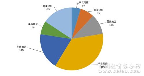 從12月招標(biāo)采購信息地區(qū)統(tǒng)計圖(如圖3所示)和全國招標(biāo)采購信息量地區(qū)占比圖(如圖4所示)可以看出:華東地區(qū)招標(biāo)采購信息量為1408條,占比32%;華北地區(qū)招標(biāo)采購信息量為823條,占比19%;華南地區(qū)招標(biāo)信息采購量為624條,占比14%;西北地區(qū)招標(biāo)采購信息量為463條,占比11%;西南地區(qū)招標(biāo)采購信息量為442條,占比10%;華中地區(qū)招標(biāo)采購信息量為369條,占比8%;東北地區(qū)招標(biāo)采購信息量為244條,占比6%。