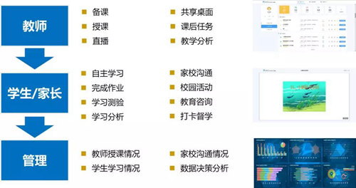 疫情期間的天聞數媒在線智慧教學解決方案基于ECO云開放平臺,整合Ai課堂、Ai作業、在線直播、校比鄰四大核心產品,聚集ECR教育資源云平臺中精準、豐富、優質的數字化內容,完整覆蓋課前、課中、課后、課外的教與學全流程,通過統一的訪問入口,為學校、教師、學生、家長提供無處不在的互動教學及資源共享服務,真正實現疫情期間“離校不離教,停課不停學”。
