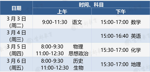 本次測試全市統一命題,統一考試時間,于3月3日-6日進行。具體測試安排如下: