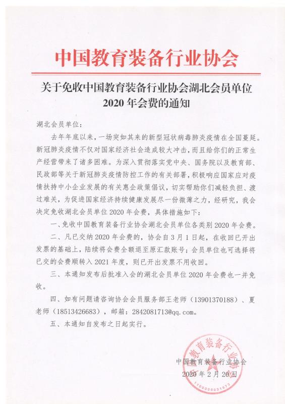關于免收中國教育裝備行業協會湖北會員單位2020年會費的通知