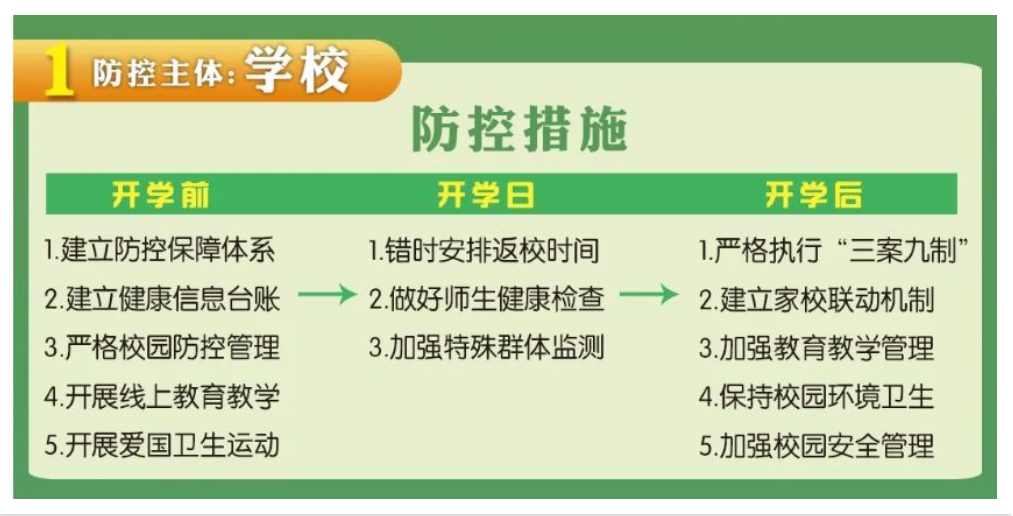 根據疫情防控的需要,合肥市教育局在2月25日下午發布了《合肥中小學幼兒園新冠肺炎疫情防控流程圖》以流程圖的形式詳細規定了學校、班主任、家長、學生四個主體在開學前、開學日、開學后所要采取的每項防控措施。