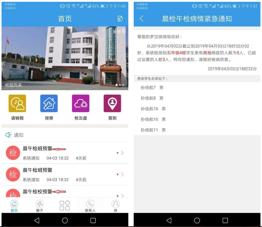 當班級學生病癥、體溫檢測異常到達系統預警閥值時,系統會發出預警。班主任老師也能收到的預警通知,以進行相應的應急管理工作。
