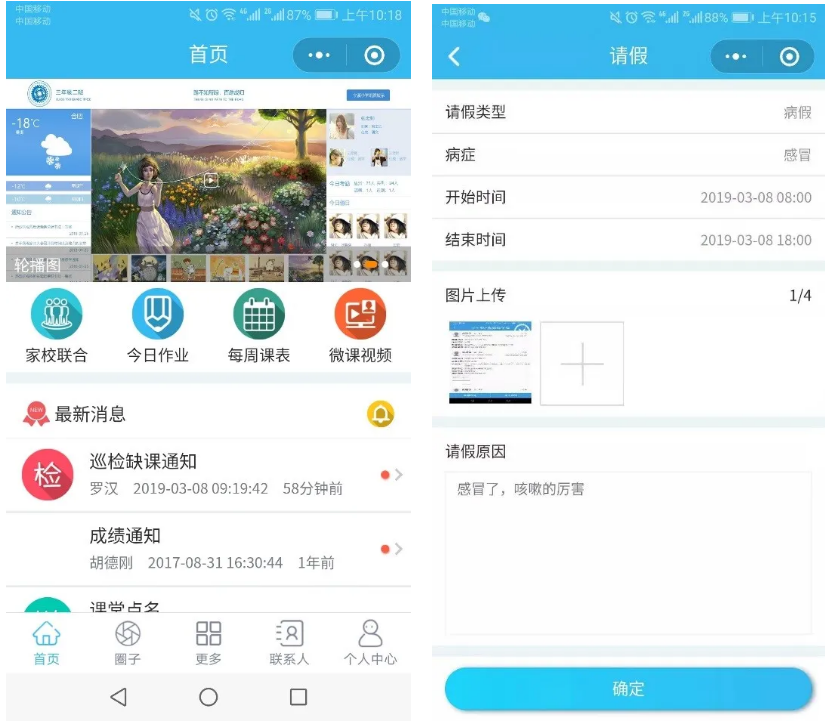 另外,學生家長通過家長端一鍵發起事、病假請假,請假數據同步到教師端;可以便捷報送家庭監測信息給學校,實現家校聯動。