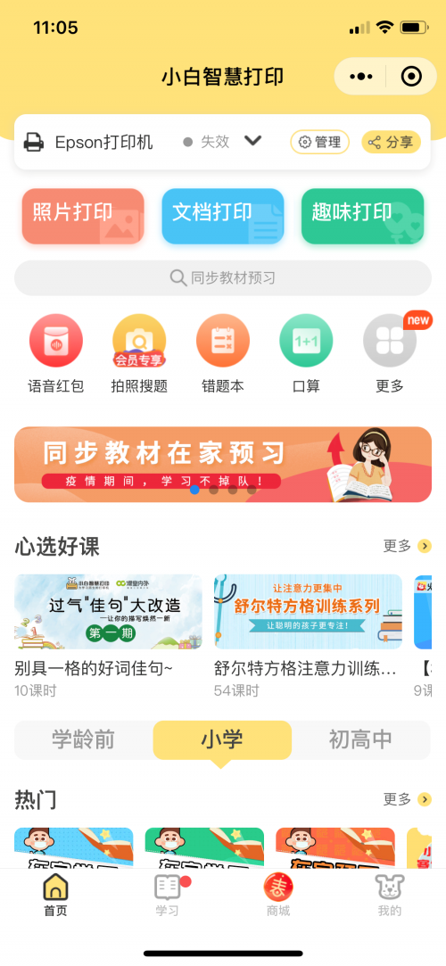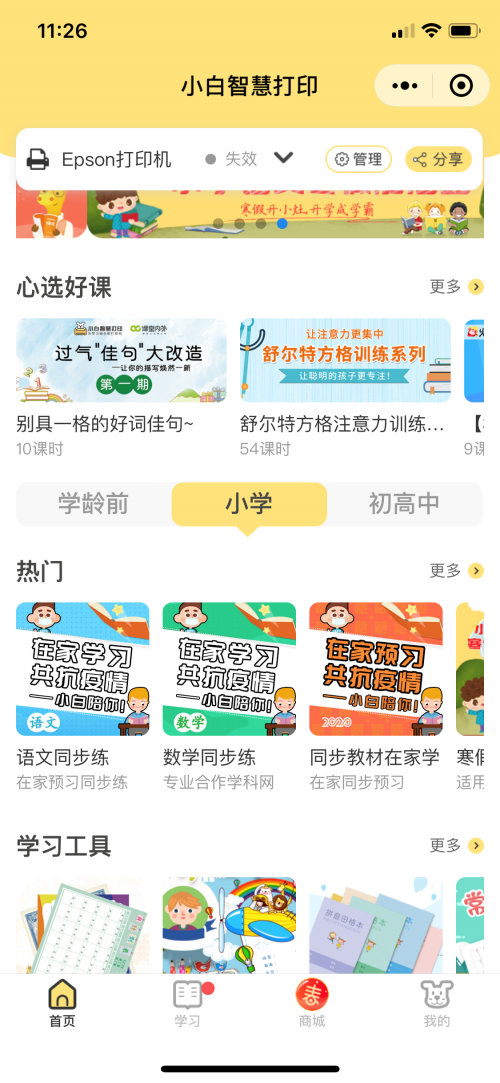 學校延期開學,就意味著開學后學習進度將被壓縮,這也將會讓孩子的課業壓力成倍增加。而在補習班也同樣不開課的情況下,讓孩子跟上進度不被同學落下,成為這段時間家長共同的想法。愛普生微信小程序—“小白智慧打印”想家長之所想,即日起學生可通過小白智慧打印, 打印相應年級的學習資料。百分百還原課堂學習標準,消除家長焦慮,讓學生在家也能高效學習。