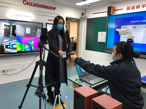 疫情防控期間,學生如何安全復課是大家最關心的問題。就在今天,長虹教育推出了一款數據采集系統,運用大數據、物聯網等技術,對學生、教師等流動人員進行疫情防控監測。技術人員給我們演示,一個紅外測溫儀、一個掃碼槍,學生佩戴一個二維碼,就可以有序“掃碼”入校。