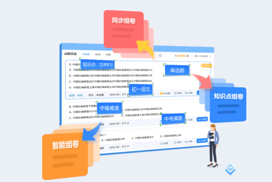 在線組卷考試,試題庫是否足量適當(dāng)很關(guān)鍵。AI測評的題庫中心包含各學(xué)段、多學(xué)科、多版本的試題資源,老師可以從章節(jié)、知識點(diǎn)、題型、難度等多維度進(jìn)行查詢。“支持知識點(diǎn)組卷、同步組卷、智能組卷三種組卷模式,老師可根據(jù)需求來選擇。”付華林說。