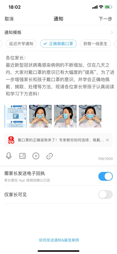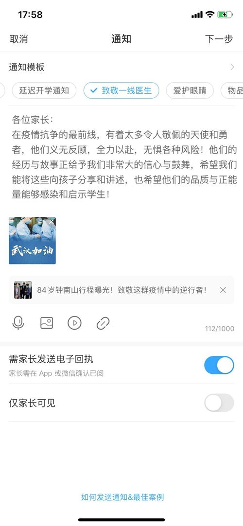抵御疫情,通知及時(shí)性顯得尤為重要。班優(yōu)為老師提供了關(guān)于此次新型肺炎的通知模版,老師只需輕編輯,上傳所需圖片、視頻,就可以向家長、學(xué)生科普疫情知識,傳遞正能量。