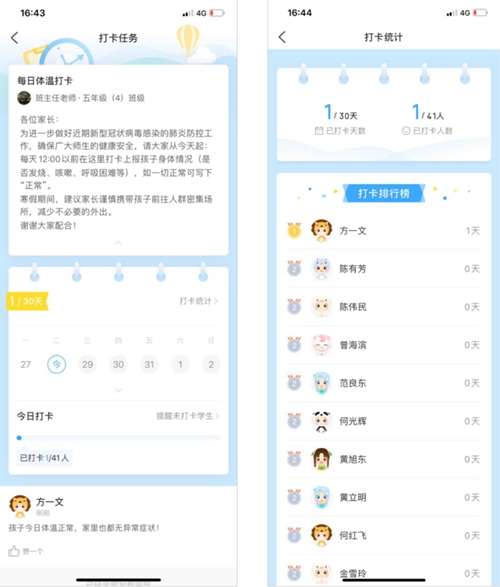 PS:家長每天在后臺完成打卡后,無需老師爬樓登記,系統(tǒng)可自動統(tǒng)計(jì)打卡情況,本班學(xué)生身體情況一目了然,以便老師開展下一步的防控措施。