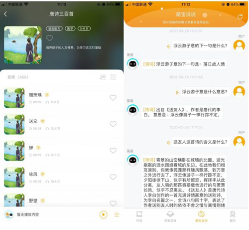 當(dāng)讀詩和對(duì)詩不成問題時(shí),阿爾法蛋會(huì)引導(dǎo)孩子們逐漸了解詩詞的含義,比如孩子問:"'浮云游子意'是什么意思?""《送友人》這首詩的含義。""《送友人》的作者是誰?"……阿爾法蛋都會(huì)耐心地為小朋友們講解。能夠熟讀、又能了解含義,孩子們對(duì)古詩的興趣越來越高,背起古詩來也容易許多。這個(gè)時(shí)候,不用多費(fèi)功夫,孩子就已經(jīng)能夠倒背如流啦。